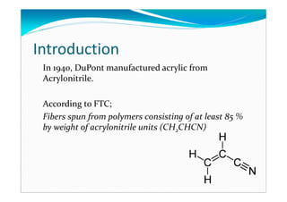 This document describes the production and properties of acrylic fibers. Acrylic is produced from acrylonitrile monomer through polymerization. It can be produced through dry or wet spinning processes where the polymer solution is extruded and dried, causing the polymer to solidify into fibers. Acrylic fibers have good tensile strength, elongation, elastic recovery and resistance to sunlight, acids and insects. Its properties make it suitable for uses such as apparel, knitwear, blankets and carpets.