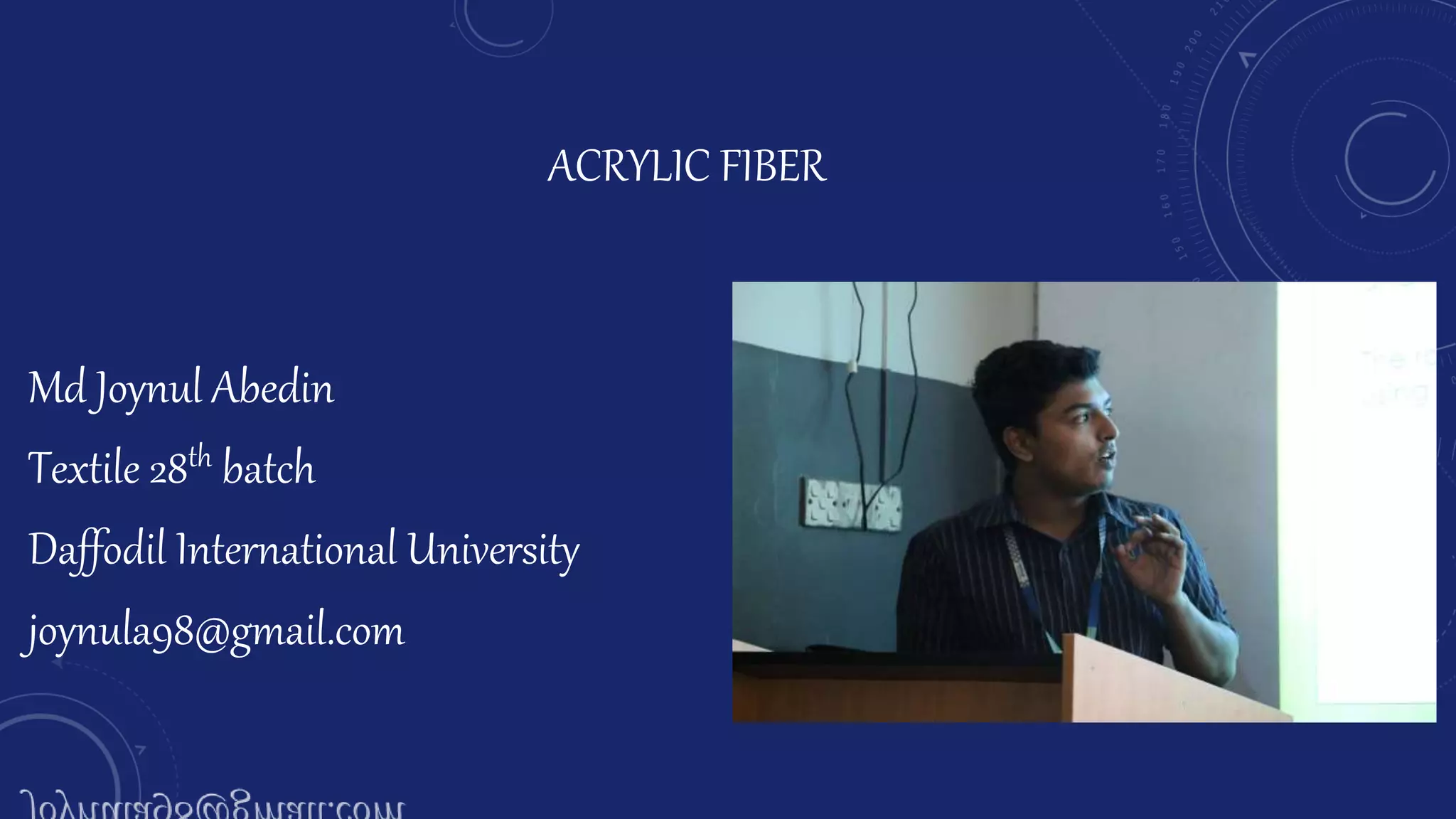 Acrylic fiber was first created by DuPont in 1941 under the trade name Orlon. It began large scale production in the 1950s. Acrylic fiber is made from acrylonitrile monomer which is derived from acetylene and hydrogen cyanide. The monomer undergoes polymerization with co-monomers like vinyl chloride or methyl acrylate. The manufacturing process involves the polymerization of acrylonitrile followed by extrusion to form fibers. Acrylic fiber has good elastic recovery, is resistant to chemicals and sunlight, retains warmth well and is easy to dye. It is used for clothing, home furnishings, industrial applications, and other uses.