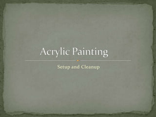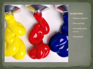 The document provides tips for using acrylic paint, including that it dries quickly, can be painted over, and is permanent. It recommends using gesso to prime canvases, and notes that gesso will not come out of clothes. It also provides guidelines for setting up a palette, such as leaving a well for mixing and organizing colors by warm/cool and light/dark tones. Clean water and brushes are emphasized to avoid contamination of paints.