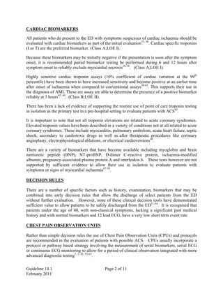 3) Chest pain observation units allowing clinical observation and serial testing are recommended to safely evaluate patients, reduce costs and lengths of stay compared to simple discharge decision rules. Imaging techniques also provide diagnostic and prognostic information but require consideration of risks.