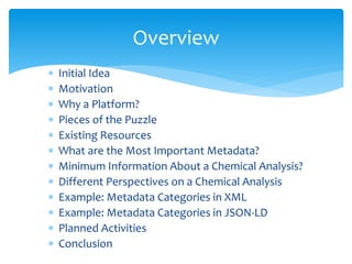 The document discusses the Chemical Analysis Metadata Platform (CHAMP) aimed at establishing data standards for chemical analysis information, emphasizing the need for universally applicable metadata and user-specific formats. It outlines the motivation for the platform, existing resources, and various perspectives on chemical analysis metadata. The document concludes with plans for community engagement and the potential benefits of enhanced metadata identification in research data sharing.