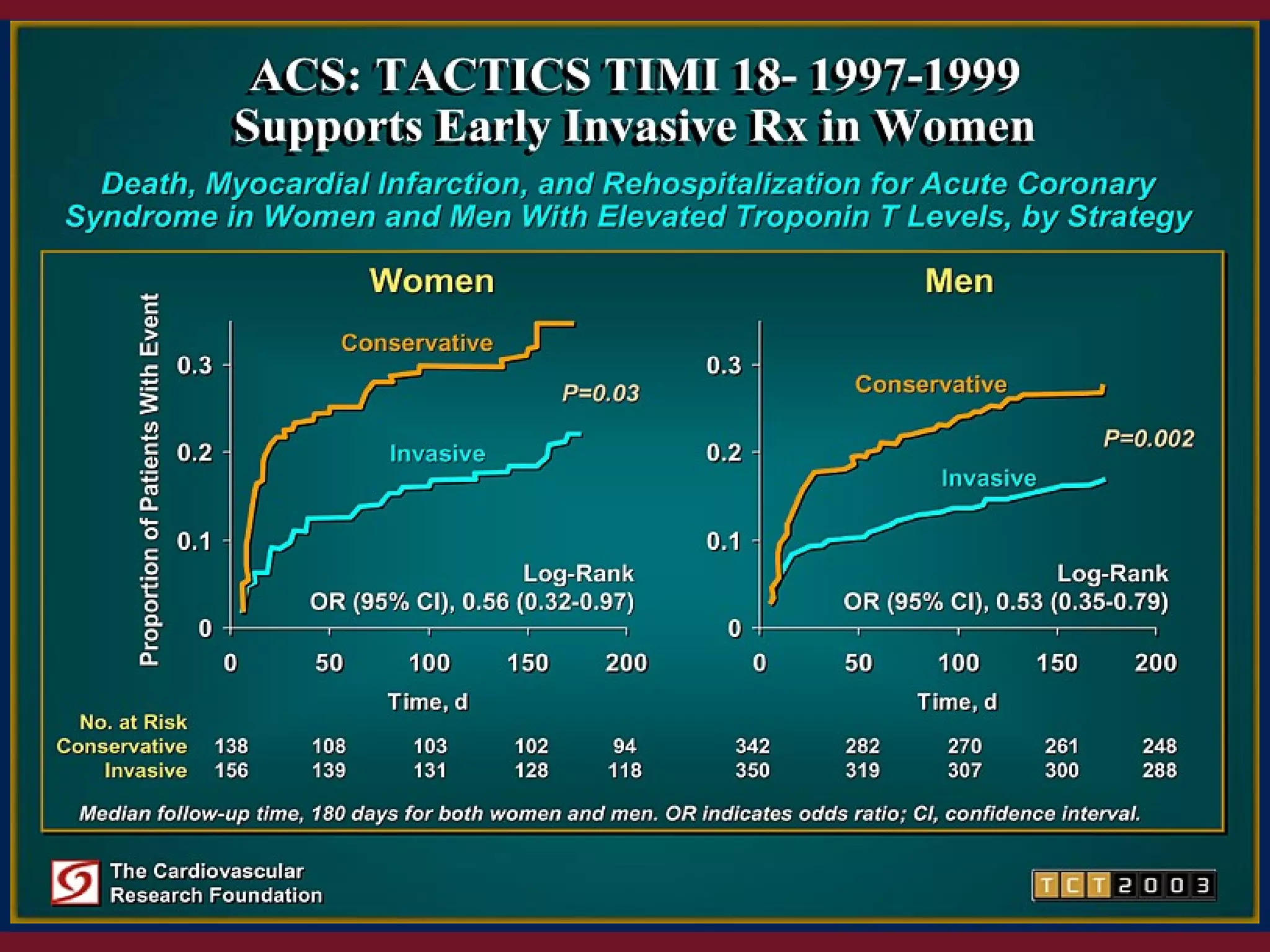 1) Women have historically experienced later referrals for treatment of ACS, resulting in more advanced coronary artery disease and worse outcomes. However, outcomes after PCI have improved over time for both men and women.