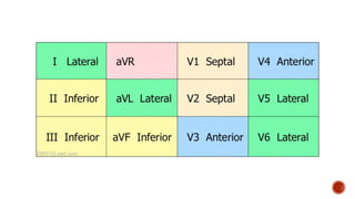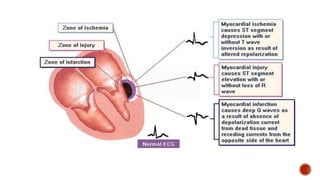 The document discusses ECG patterns that can help identify acute coronary syndromes including ST-elevation myocardial infarction (STEMI), non-ST-elevation myocardial infarction (NSTEMI), and unstable angina. Key ECG indicators of ischemia, injury, and infarction are ST segment changes, T wave changes, and presence of Q waves. ST elevation in two contiguous leads with chest pain symptoms indicates STEMI. The document provides guidance on cut-off points for ST elevation in different leads to diagnose STEMI and evaluating right ventricular involvement or posterior infarction. Repeating ECGs can help identify early changes in cases of suspected STEMI.