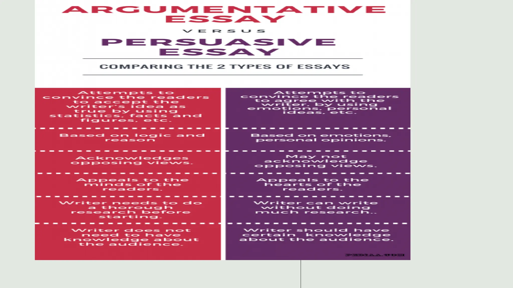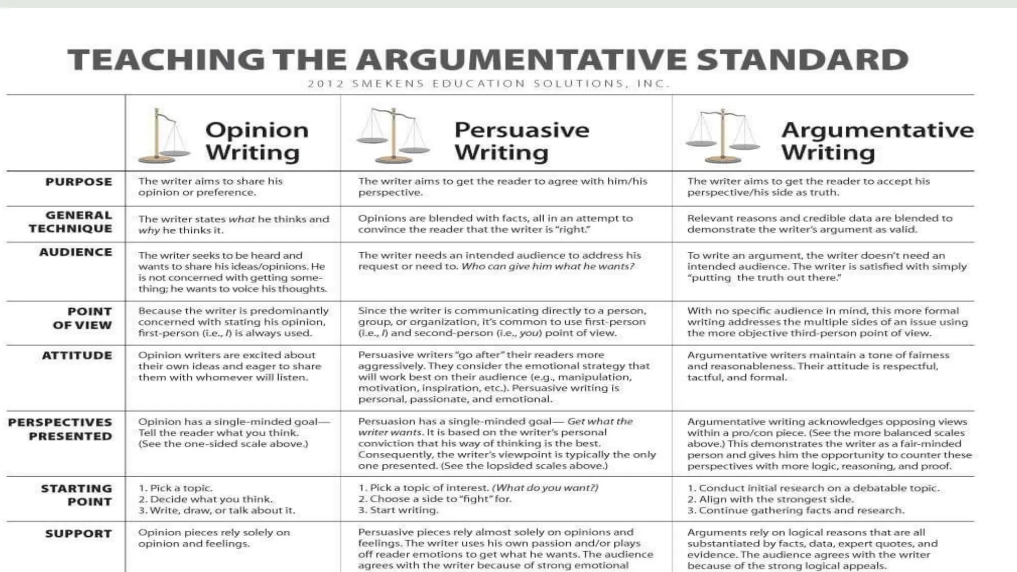 The document outlines the differences between various types of writing, focusing on argumentative writing as a balanced exploration of a topic that includes multiple viewpoints. It emphasizes the importance of research, structure, and logical reasoning in crafting an effective argumentative essay, contrasting it with persuasive writing that typically presents only one side. The guide details key components of an argumentative essay, including thesis statements, evidence, consideration of opposing views, and a conclusive synthesis of the argument.
