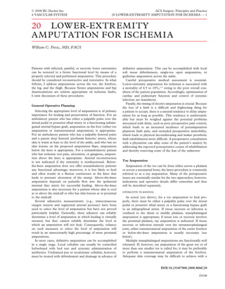 This document discusses amputation of the lower extremities for ischemia. It begins by outlining general considerations for operative planning, including selecting the appropriate amputation level based on a patient's ambulatory status and vascular exam findings. It then describes techniques for specific amputations, including: