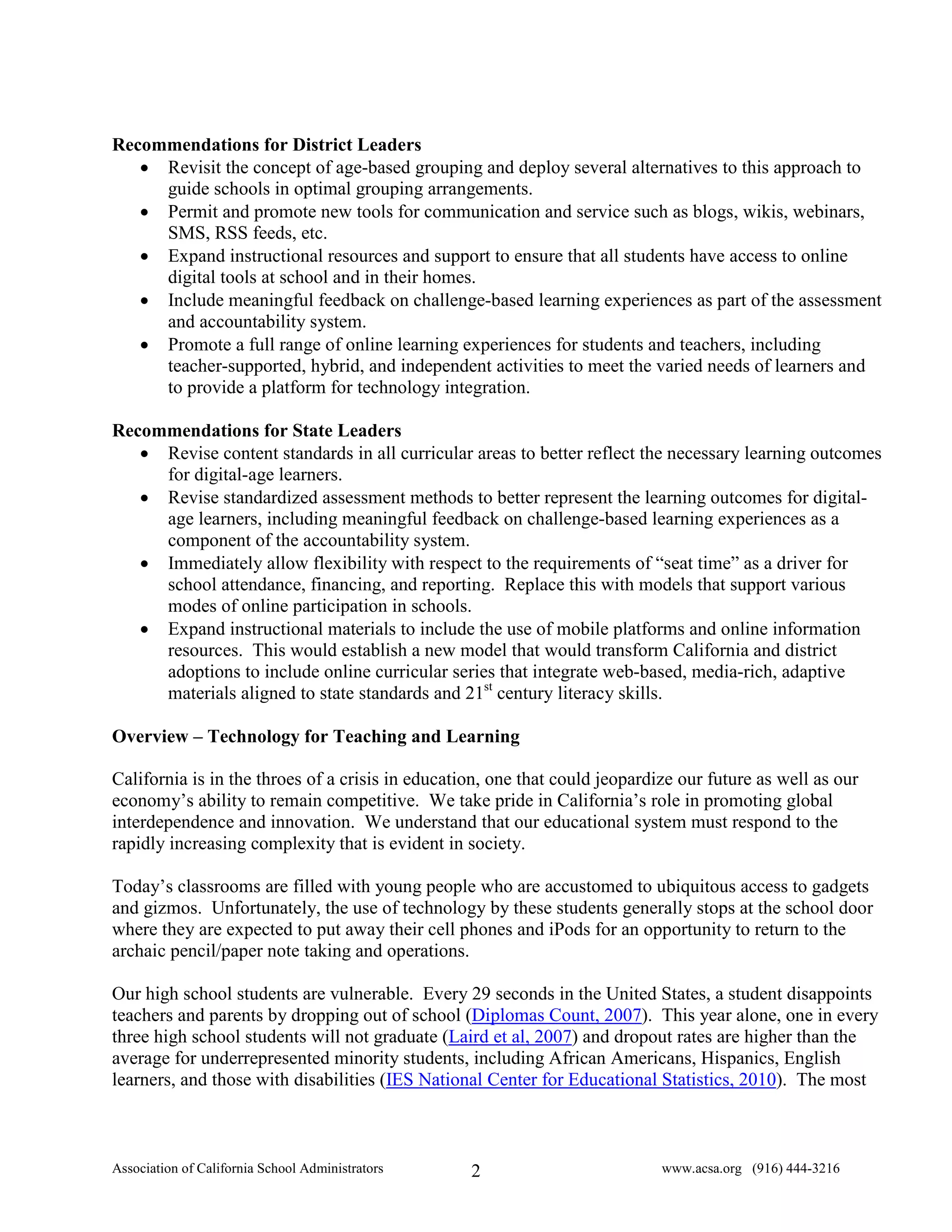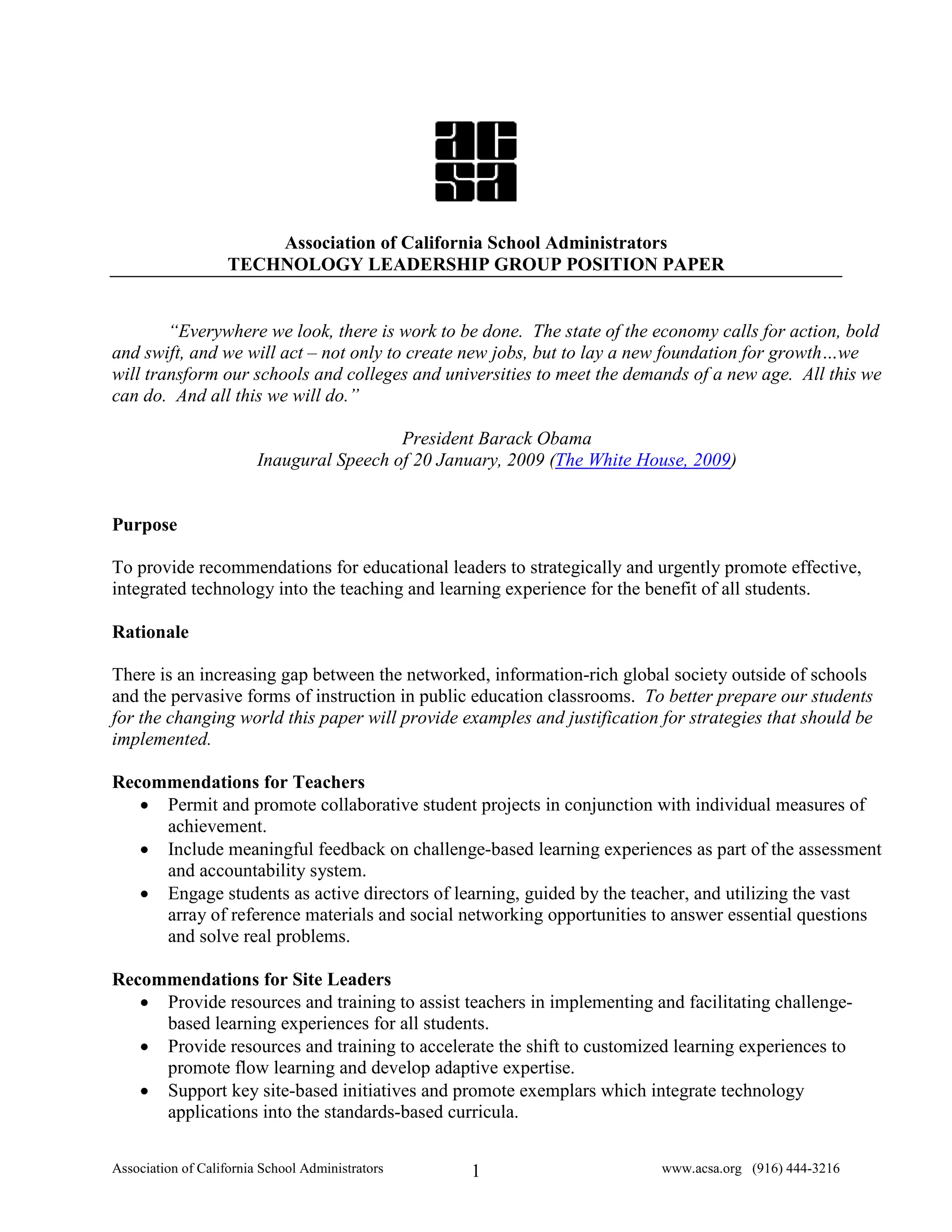 This document provides recommendations from the Association of California School Administrators' Technology Leadership Group on promoting effective technology integration into teaching and learning. It discusses the need to transform classrooms from information centers to places where students develop 21st century skills. Recommendations are provided for teachers, site leaders, district leaders, and state leaders focused on challenge-based learning, customized learning experiences, online resources, and revising standards and assessments to reflect digital-age needs. The goal is to better prepare students through strategies that engage them and develop skills like problem-solving, critical thinking, and digital literacy.