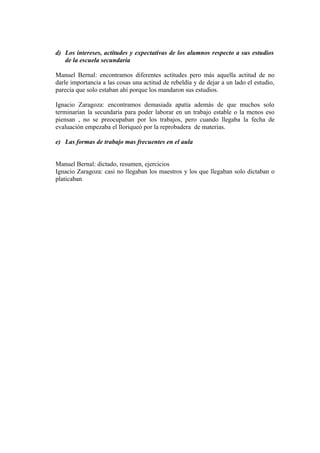 Este documento resume las observaciones de las visitas a dos escuelas secundarias en México. La Escuela Manuel Bernal tenía más de 35 estudiantes por salón debido a la sobrepoblación, mientras que la Escuela Ignacio Zaragoza tenía problemas con la falta de maestros. En general, las relaciones entre estudiantes y maestros no eran buenas, y los estudiantes mostraron poca motivación y expectativas bajas sobre sus estudios. Las principales formas de enseñanza observadas fueron dictado, resumen y ejercicios.