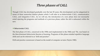 This document discusses the history and phases of computer-assisted language learning (CALL). It describes three phases: behavioral CALL from the 1950s-1970s focused on drill-based practice; communicative CALL from the 1970s-1980s emphasized authentic communication; and integrative CALL from the 1990s onward combined multimedia like text, graphics, sound and video to more authentically integrate skills. The document also discusses how computer-mediated communication and the internet, particularly the World Wide Web, facilitated collaborative writing and access to authentic materials. Finally, it briefly outlines the role of information and communication technologies in international development efforts according to the World Summit on the Information Society, and some challenges to ICT adoption like various digital divides.