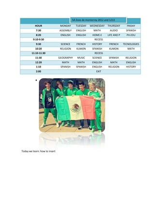 The document contains the class schedule for a school in Monterrey for 2012-2013. It lists the subjects taught each day of the week on an hourly basis, including assemblies, recess periods, and class exit times. Classes include core subjects like math, science, English and history as well as electives such as music, physical education and technologies.