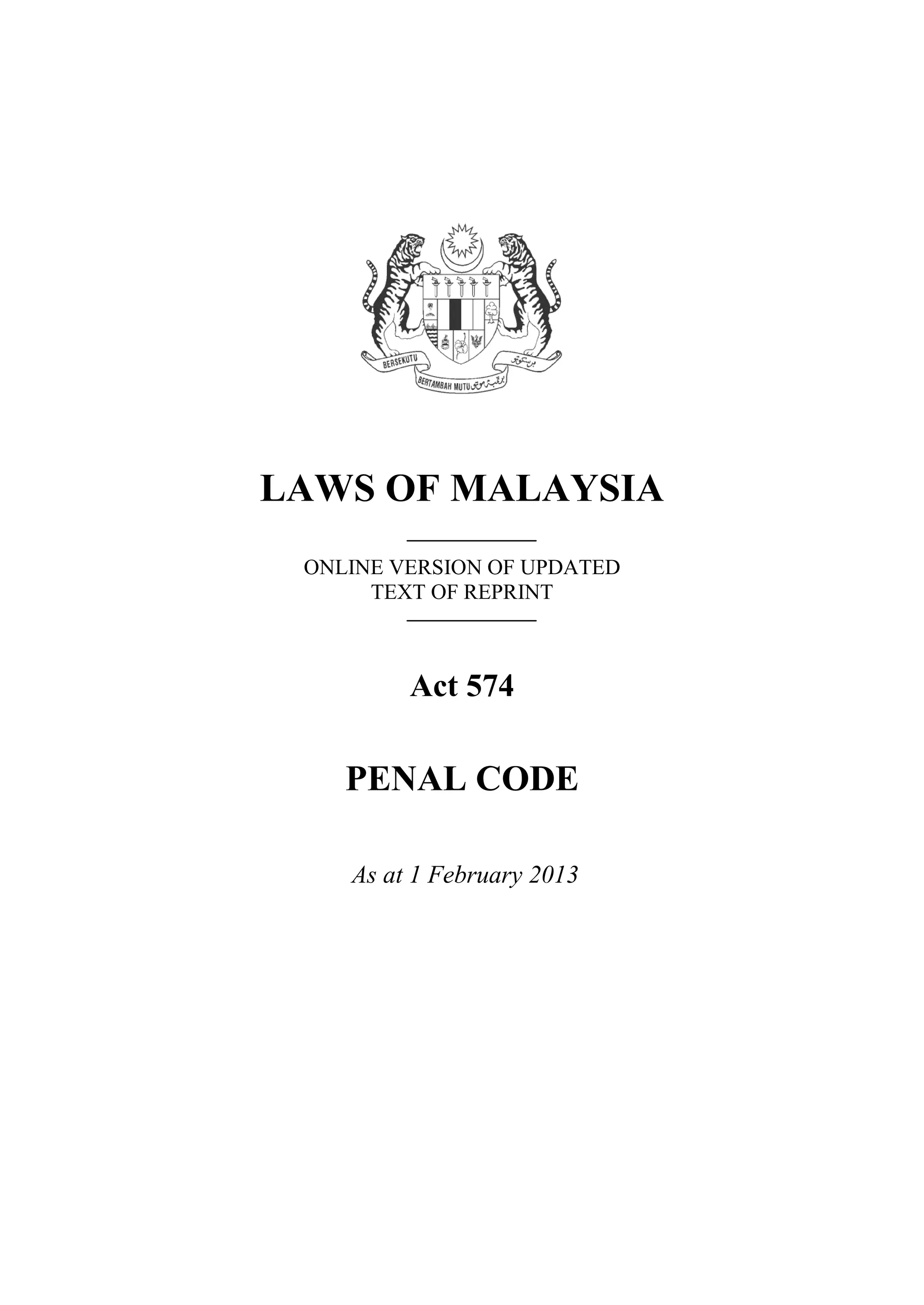 This document provides the text of Malaysia's Penal Code (Act 574). It includes sections on: