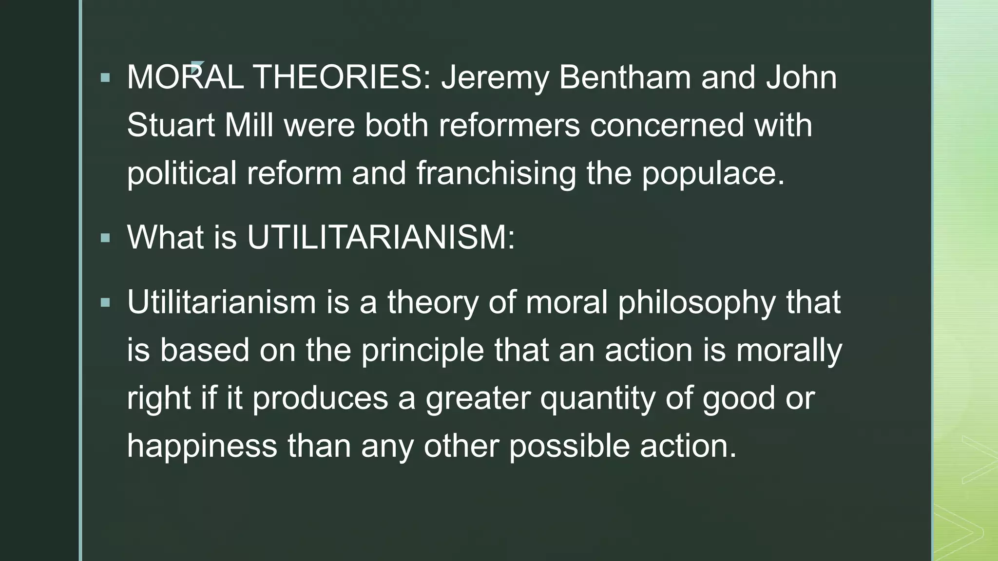 Utilitarianism is a moral theory developed by Jeremy Bentham and John Stuart Mill that states an action is morally right if it produces the greatest amount of happiness or good for the greatest number of people. It judges the morality of actions based on their consequences and maximizing overall well-being.