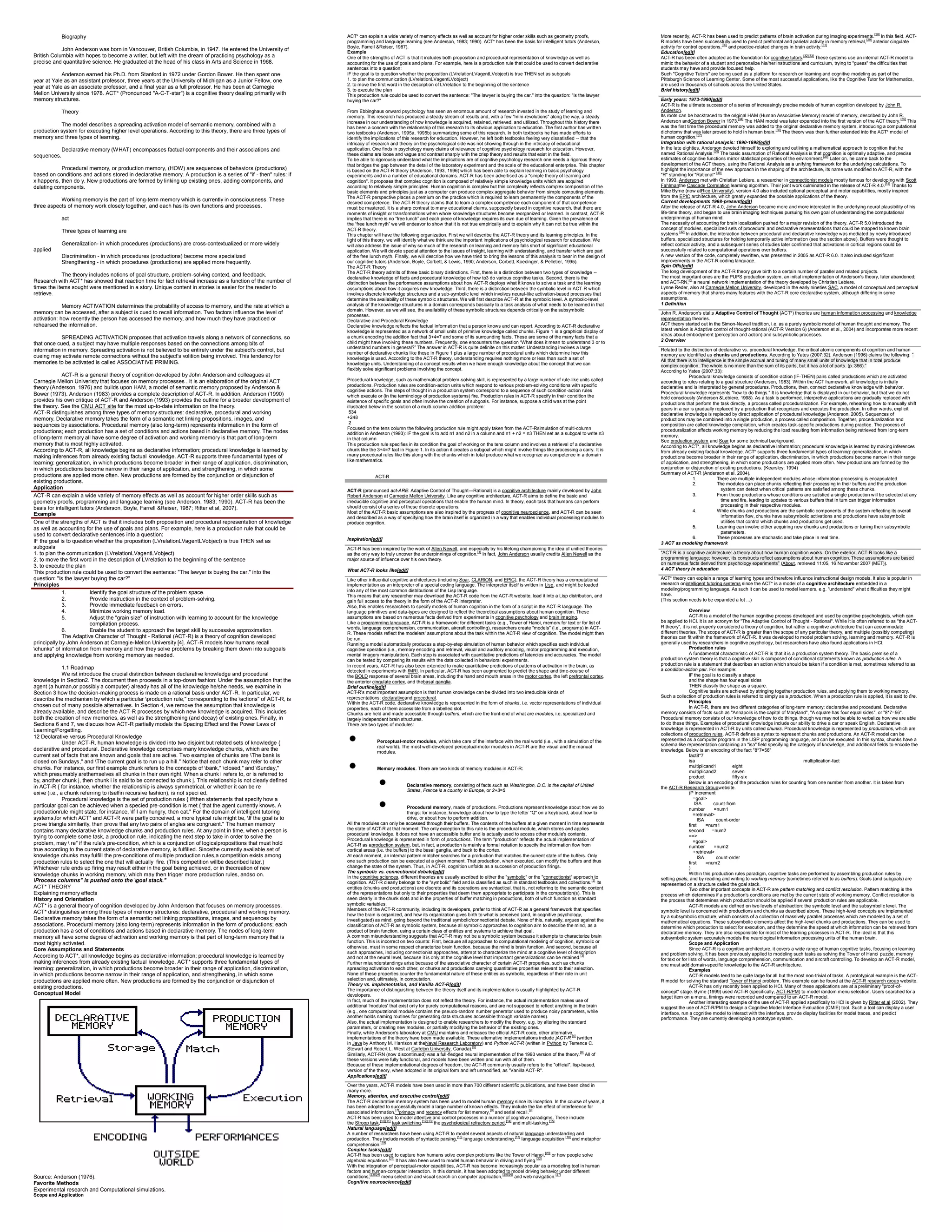 John Anderson was born in 1947 in Vancouver, British Columbia. He earned his PhD from Stanford University in 1972 and has been a professor at several universities, including Carnegie Mellon University since 1978. ACT* is a cognitive theory developed by Anderson that describes a spreading activation model of semantic memory combined with a production system for executing higher-level operations. It distinguishes three types of memory - declarative, procedural, and working memory - and three types of learning.