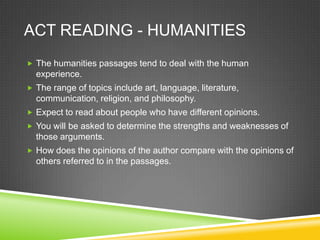 The document provides information about the types of passages and questions that may appear on the ACT Reading section for humanities passages. These passages typically deal with topics relating to art, language, literature, religion, and philosophy. Readers should pay attention to different opinions expressed and how the author's views compare to others mentioned. Questions may ask about main ideas, details, relationships, and viewpoints discussed in the passages. Answers must be justified based on information or ideas from the given text.
