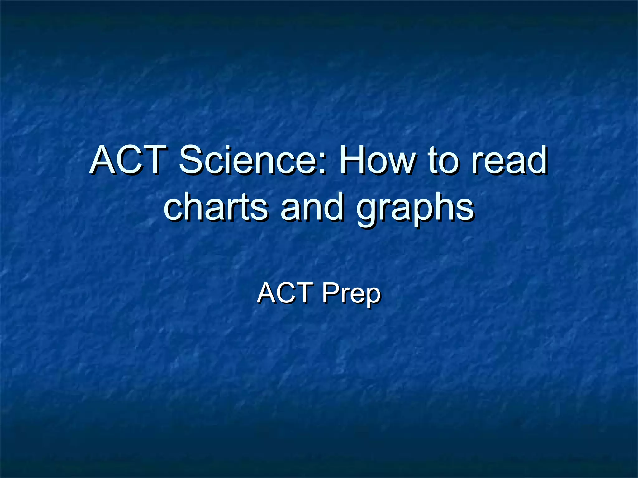 This document provides tips on how to read charts and graphs for the ACT science section. It discusses identifying the type of information presented in titles and legends. It emphasizes being able to determine both what a chart conveys as well as what information it does not include. Examples are given of different types of charts and how to interpret the data as well as limitations. Key points are to carefully examine all elements of a chart and think critically about what can and cannot be concluded from the visual representation.