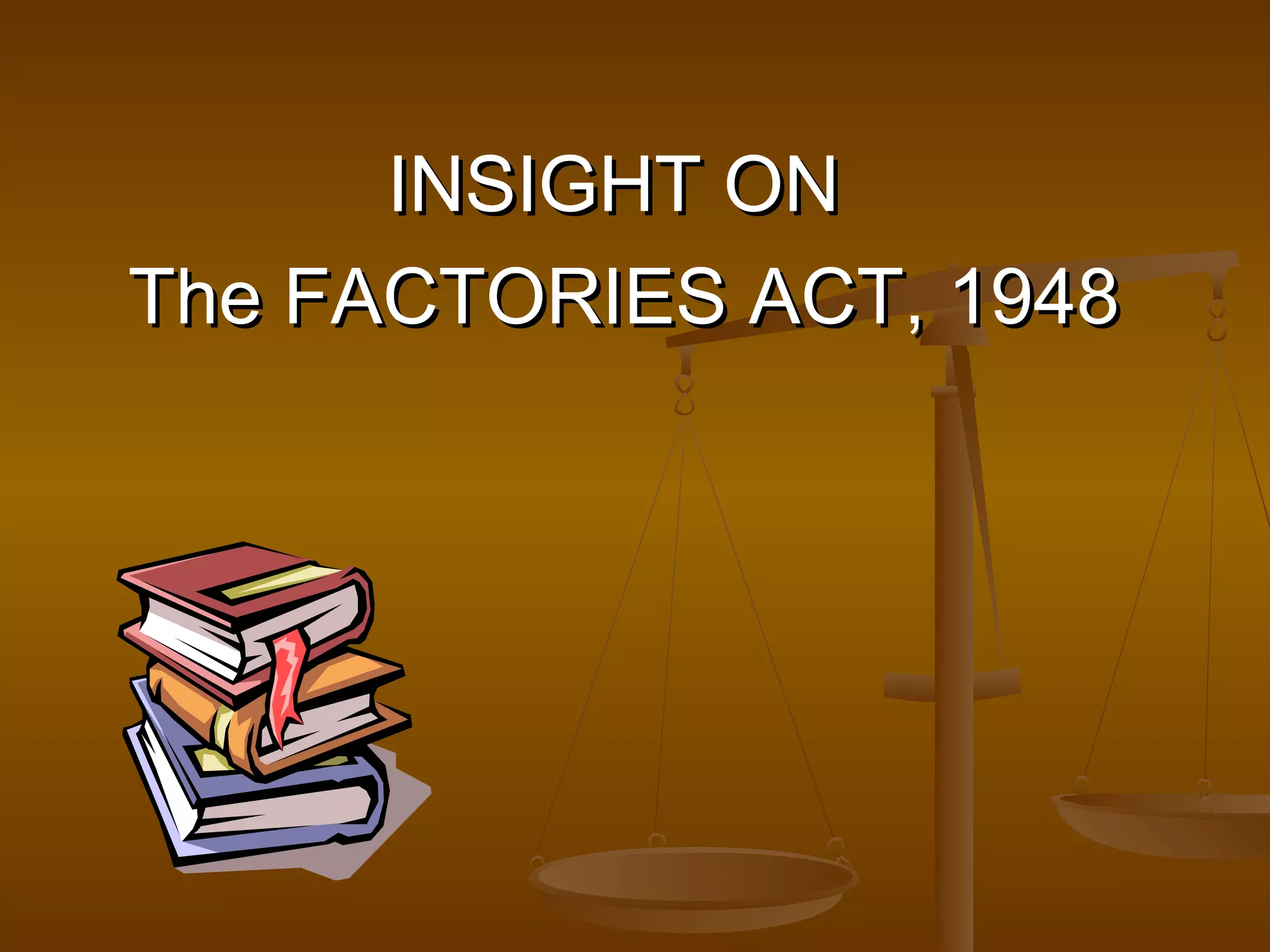 The document discusses the Factories Act of 1948 and the Department of Factories and Boilers in India. It outlines the department's main objective of ensuring compliance with labor legislation for factories. It lists 10 labor laws that the department enforces, including the Factories Act of 1948. It then provides more details on the Factories Act, including its provisions for health, safety, welfare, working hours and leave for factory workers. It also discusses the roles and responsibilities of occupiers, managers and inspectors in enforcing the legislation.
