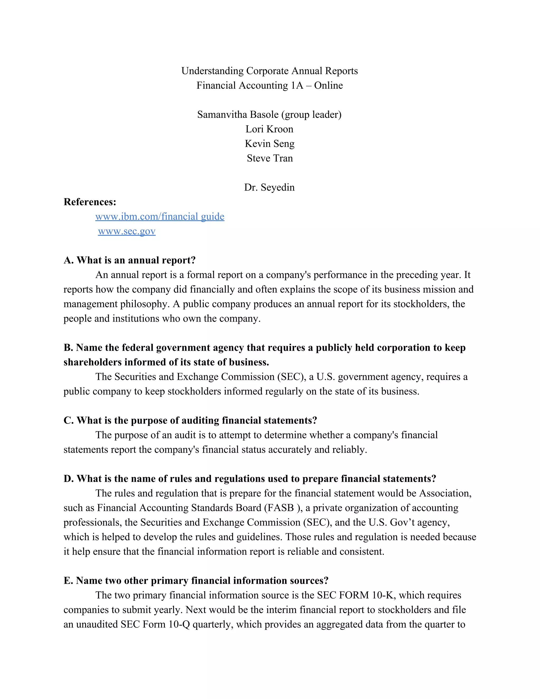 This document provides an overview of understanding corporate annual reports. It discusses what an annual report is and its purpose of informing stockholders about a company's financial performance and operations. The Securities and Exchange Commission requires publicly traded companies to publish annual reports and keep stockholders informed. Financial statements like the income statement, balance sheet, and statement of cash flows are included in annual reports to provide information on earnings, financial position, and cash flows. The document also reviews accounting standards and regulations companies must follow in preparing financial statements.