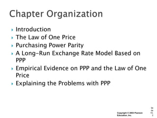 This document discusses theories of long-run exchange rates, including purchasing power parity (PPP) and the law of one price. It provides empirical evidence that PPP does not perfectly hold in reality due to trade barriers, departures from perfect competition, and differences in measuring price levels across countries. The document also examines a monetary model of exchange rates and how changes in money supplies, interest rates, and output can impact nominal and real exchange rates in the long run.