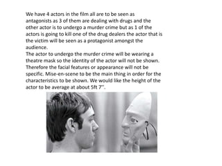The document outlines requirements for 4 actors in an upcoming film. Three of the actors will portray drug dealers, while the fourth will undergo a murder. One drug dealer will be killed, making them a protagonist. The murder victim will wear a theater mask to hide their identity. The second actor needs to be a light-skinned, fairly tall male with dark brown hair around 6 feet tall. The third actor should be a tall Pakistani male who can blend into the average community without seeming criminal. The fourth actor should be a light-skinned male with dark blonde hair and glasses who wouldn't appear crime-involved.