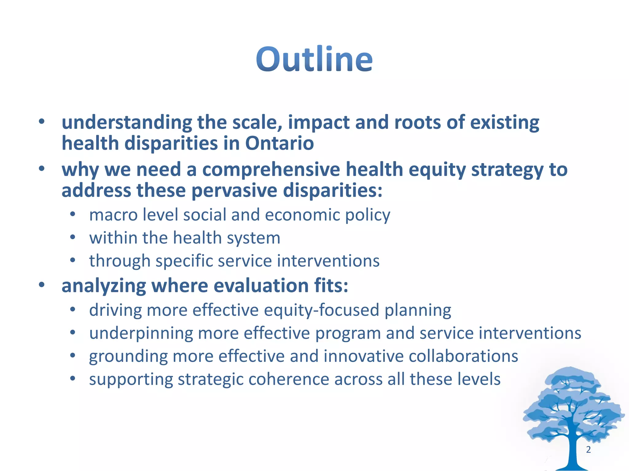 The document discusses the pervasive health disparities in Ontario, emphasizing the need for a comprehensive health equity strategy to address the systemic roots of these inequalities. It outlines the importance of equitable access to quality healthcare and the integration of social determinants of health in policy design and program interventions. The document highlights successful international examples and concludes with a call for targeted actions and collaborative efforts to close the health equity gap.