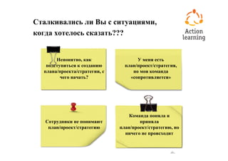 Документ обсуждает философию action learning и его применение в бизнесе, акцентируя внимание на решении реальных задач и создании общего видения для достижения целей. Он подчеркивает важность коммуникации, вовлечения сотрудников в процесс и совместного обсуждения проектов для успешного внедрения новых идей. Описываются критерии участия в проектах и примеры компаний, внедривших этот подход.