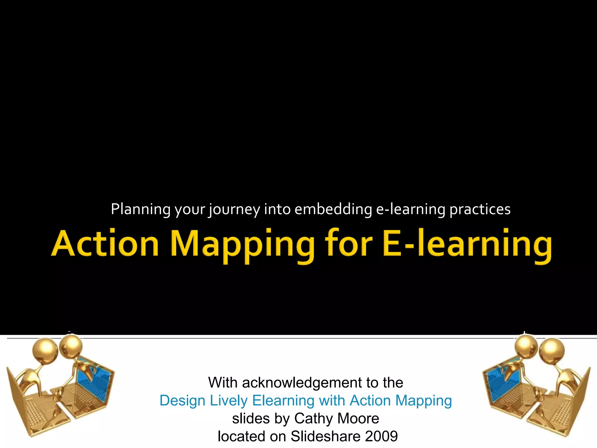 This document discusses using action mapping to plan an e-learning project. It recommends identifying goals, actions needed to achieve the goals, practice activities to support the actions, and essential information for the activities. An action map visually connects these elements and helps ensure the e-learning project stays focused on achieving measurable goals. The process provides reusable materials and realistic activities while avoiding irrelevant information.