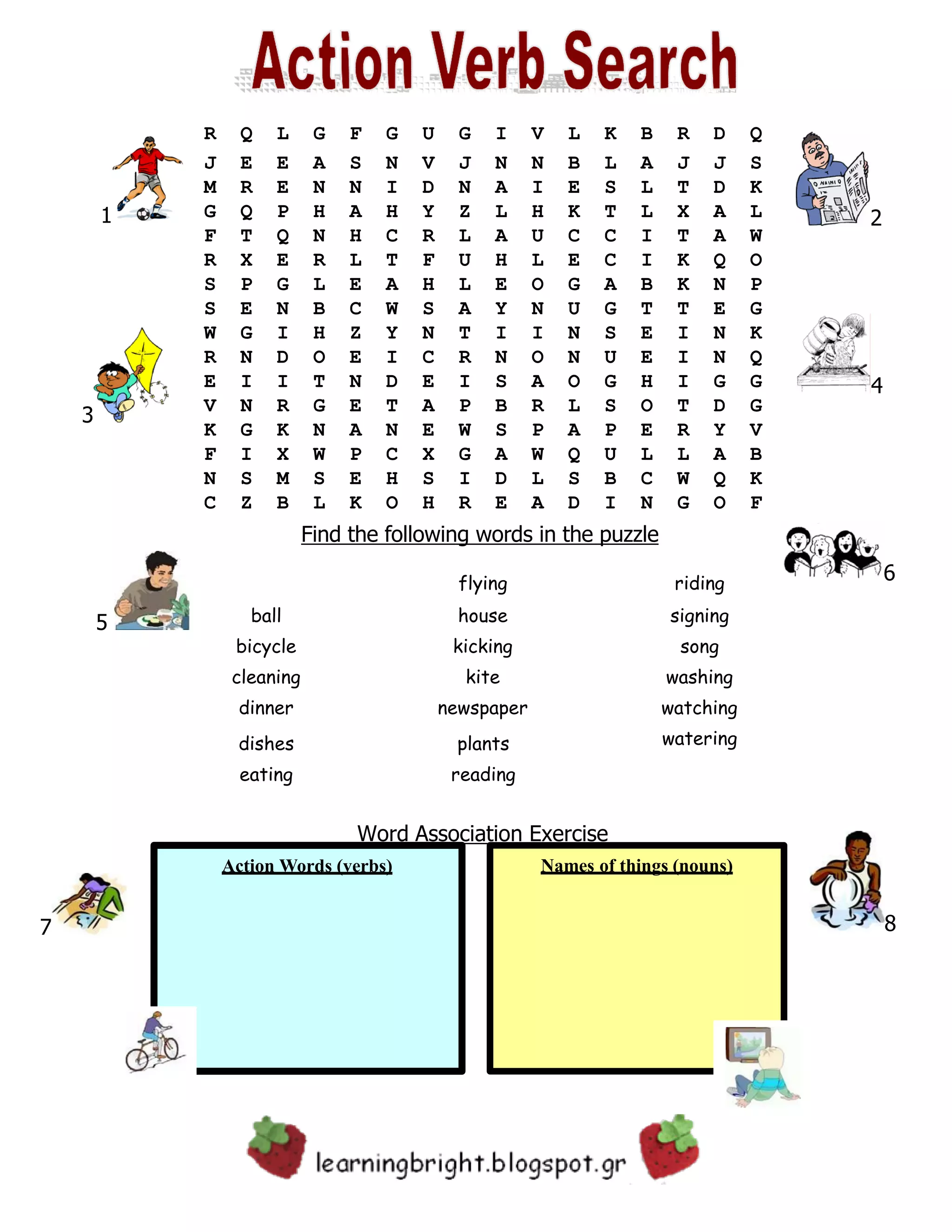 This document contains a word search puzzle with 16 nouns and verbs hidden within. The goal is to find and identify names of things (nouns) and action words (verbs) hidden in the grid. It also lists some word associations to use in a related exercise: flying/riding, ball/house, signing/bicycle, kicking/song, cleaning/kite, washing/dinner, newspaper/watching, dishes/eating, plants/reading, watering.