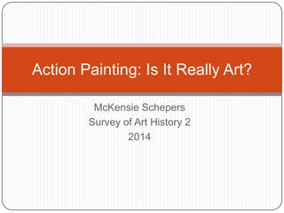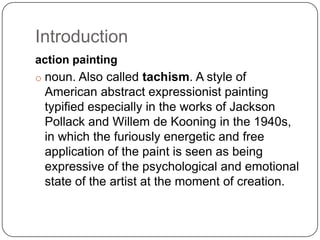 This document summarizes action painting, a style of abstract expressionism characterized by energetic and expressive application of paint. It was pioneered by artists like Jackson Pollock and Willem de Kooning in the 1940s. While some viewed action paintings as random splatters, the document analyzes works by Joan Mitchell, Jackson Pollock, Jean-Paul Riopelle, Helen Frankenthaler, and Willem de Kooning to show how they demonstrate control and composition despite their gestural styles. It addresses the criticism of whether such works can truly be considered art.