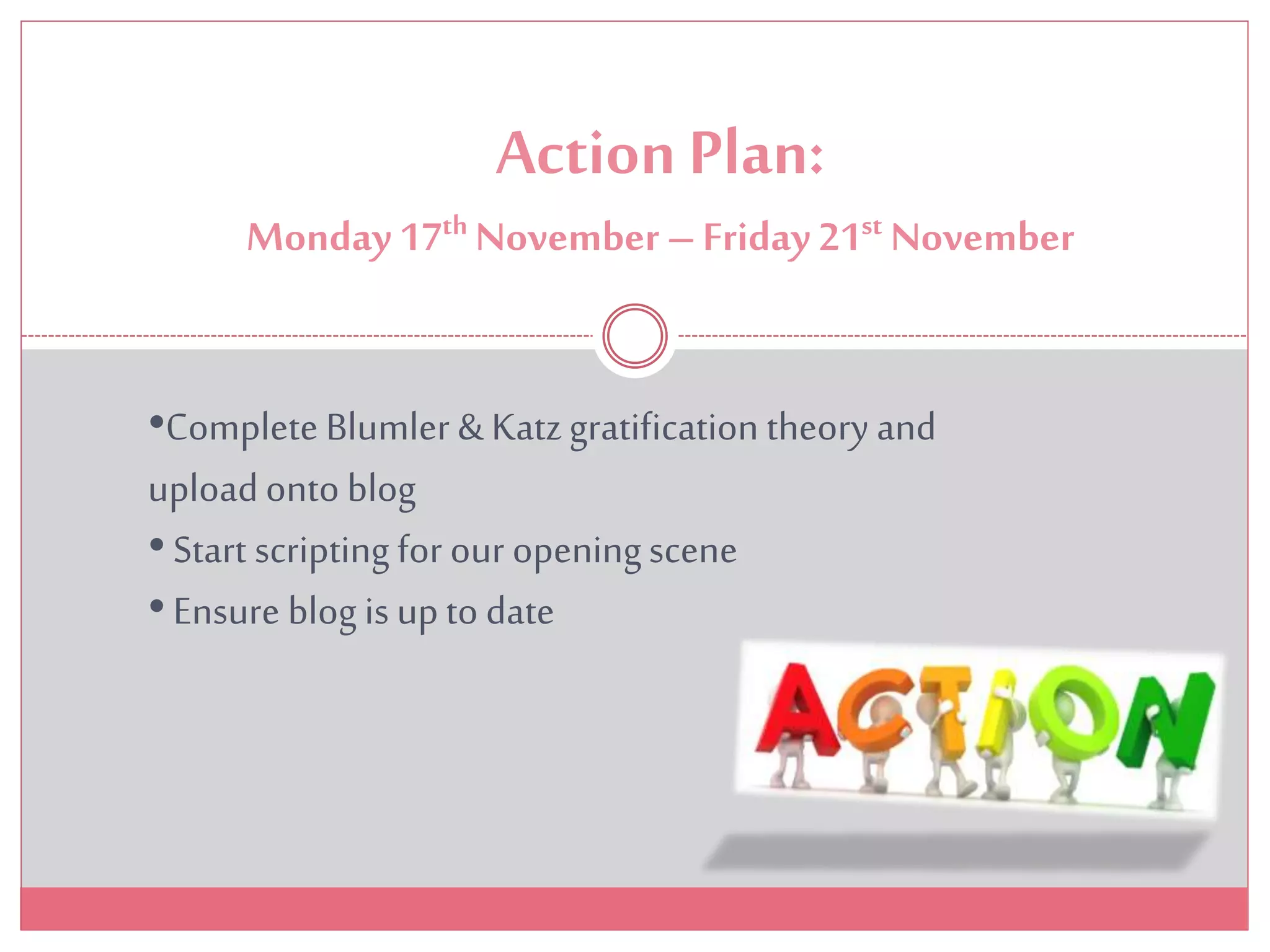 The action plan outlines tasks from Monday 17th November to Friday 21st November which include completing an analysis of Blumler & Katz's gratification theory and uploading it to a blog, starting to script an opening scene, and ensuring the blog is kept up to date.