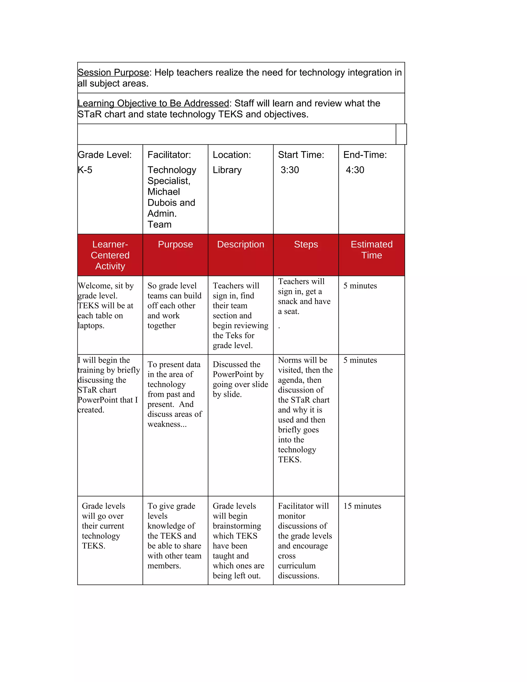 The document outlines an agenda for a staff development session on technology integration for K-5 teachers. The session will review state technology standards and objectives, demonstrate how technology can be used across subjects, identify available resources, and discuss administration expectations for technology use. Teachers will discuss standards by grade level, participate in group activities, and complete a survey to evaluate the training. The goal is to help teachers understand the need for technology in all subjects and how to incorporate it into their lessons.