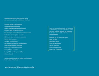 This document presents a 10-year action plan with 10 objectives to revitalize the central Delaware riverfront in Philadelphia. The plan aims to create an open, green, active and connected riverfront through public and private investment. Key actions include appointing an effective waterfront manager, adopting new zoning and planning policies, building a continuous riverfront trail, creating and improving parks, extending public access and transit to the river, and restoring the natural environment. Achieving these 10 objectives by 2018 will help realize the 30-year civic vision to reconnect residents and neighborhoods to the river.
