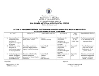 The document outlines an action plan by Malalinta National High School to provide psychosocial support and raise mental health awareness among students and staff. It includes three activities: 1) Classroom orientations during August 22-26 to prepare students for in-person classes. 2) An August 19 session for school personnel. 3) A September symposium to orient students and staff on mental health awareness. The plan aims to ensure students and staff are ready to handle challenges of in-person classes.
