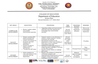 This document outlines the action plan of the College of Education Department at Cebu Technological University for the second semester of the 2022-2023 academic year. The key areas of focus are curriculum development, faculty development, and student development. For curriculum development, the department will review and update syllabi and instructional materials. For faculty development, the department will conduct seminars and trainings to enhance teaching skills and encourage faculty to pursue further studies. For student development, the department will orient students on policies, integrate values education, and encourage participation in extracurricular activities. The action plan provides strategies, timelines, and proposed budgets for each area.