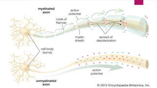 An action potential is an electrical signal that propagates along the surface of a neuron membrane due to the movement of sodium and potassium ions through specific ion channels. It occurs in four phases: 1) Resting potential with sodium and potassium channels closed, 2) Depolarization with sodium entry lowering the membrane potential, 3) Repolarization with sodium channel inactivation and potassium efflux restoring the potential, 4) Repolarization continuation with full potential restoration before returning to resting potential. This process allows an electrical signal to travel down an axon through repeated action potentials.