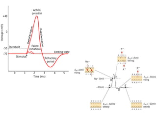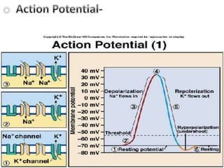 This document provides an overview of the nervous system, including classifications of neurons, their properties, and how nerve impulses are transmitted. Neurons are classified as myelinated or unmyelinated. Their key properties include excitability, conduction, transmission, integration and plasticity. The resting membrane potential is established by ion gradients maintaining different electrical charges on either side of the neuronal membrane. An action potential is initiated by the movement of ions across the membrane when it is stimulated. Neurotransmitters are released at synapses to transmit signals between neurons and elicit excitatory or inhibitory postsynaptic potentials.