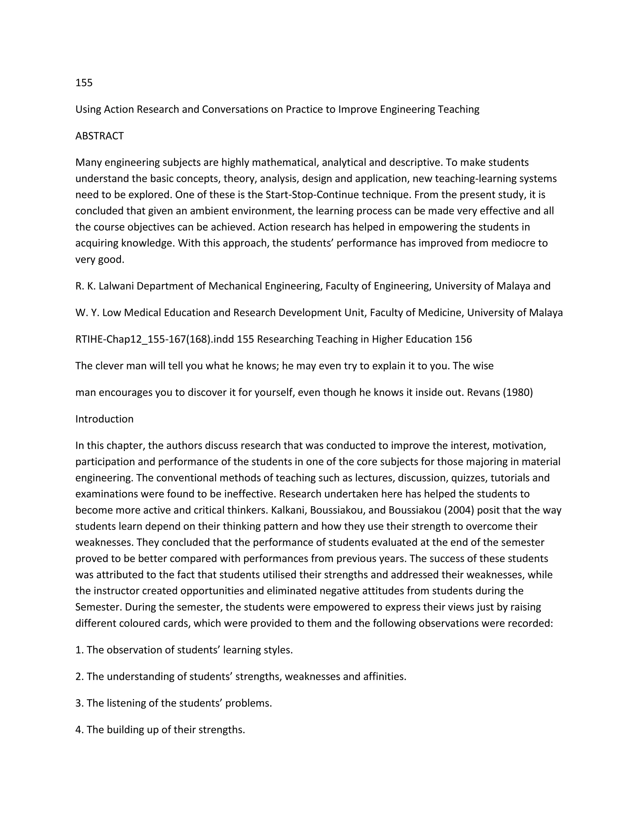 This study explores innovative teaching methods, including the start-stop-continue technique and online engagement, to enhance the learning experience of materials engineering students. The authors found that traditional teaching methods were ineffective, and leveraging action research empowered students to improve their performance and participation. The findings suggest that adapting teaching strategies to meet student needs can lead to increased motivation and better outcomes in engineering education.