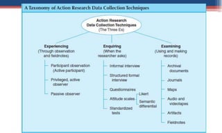 Action research (AR) is a collaborative approach aimed at improving educational practices by addressing classroom challenges through critical reflection and systematic planning. It involves multiple stakeholders, including educators and community members, to foster dialogue and implement changes while utilizing various data sources for analysis. Despite its benefits, such as enhancing teacher development and promoting better communication, AR can face challenges like resistance to change and limitations in generalizability.
