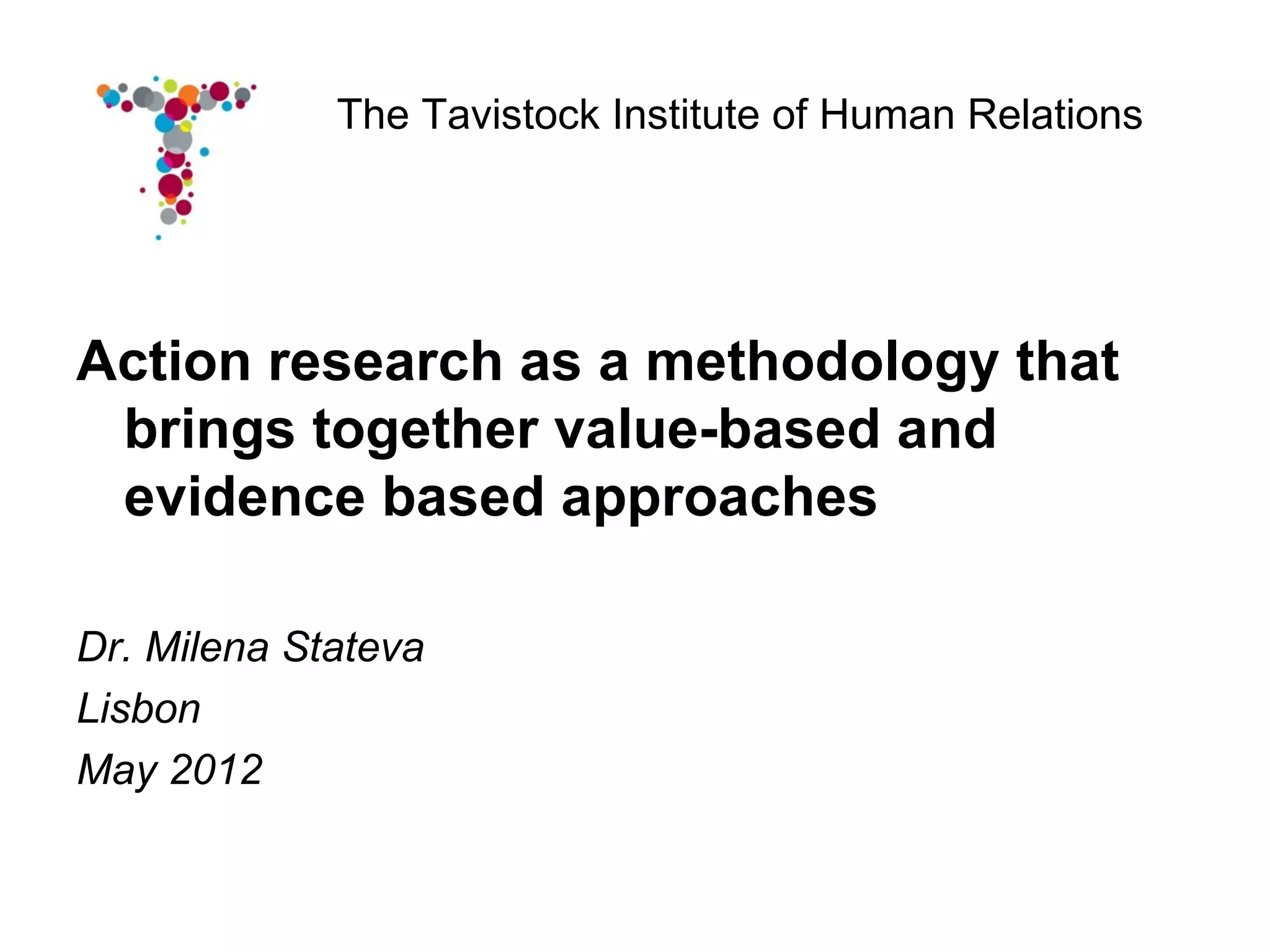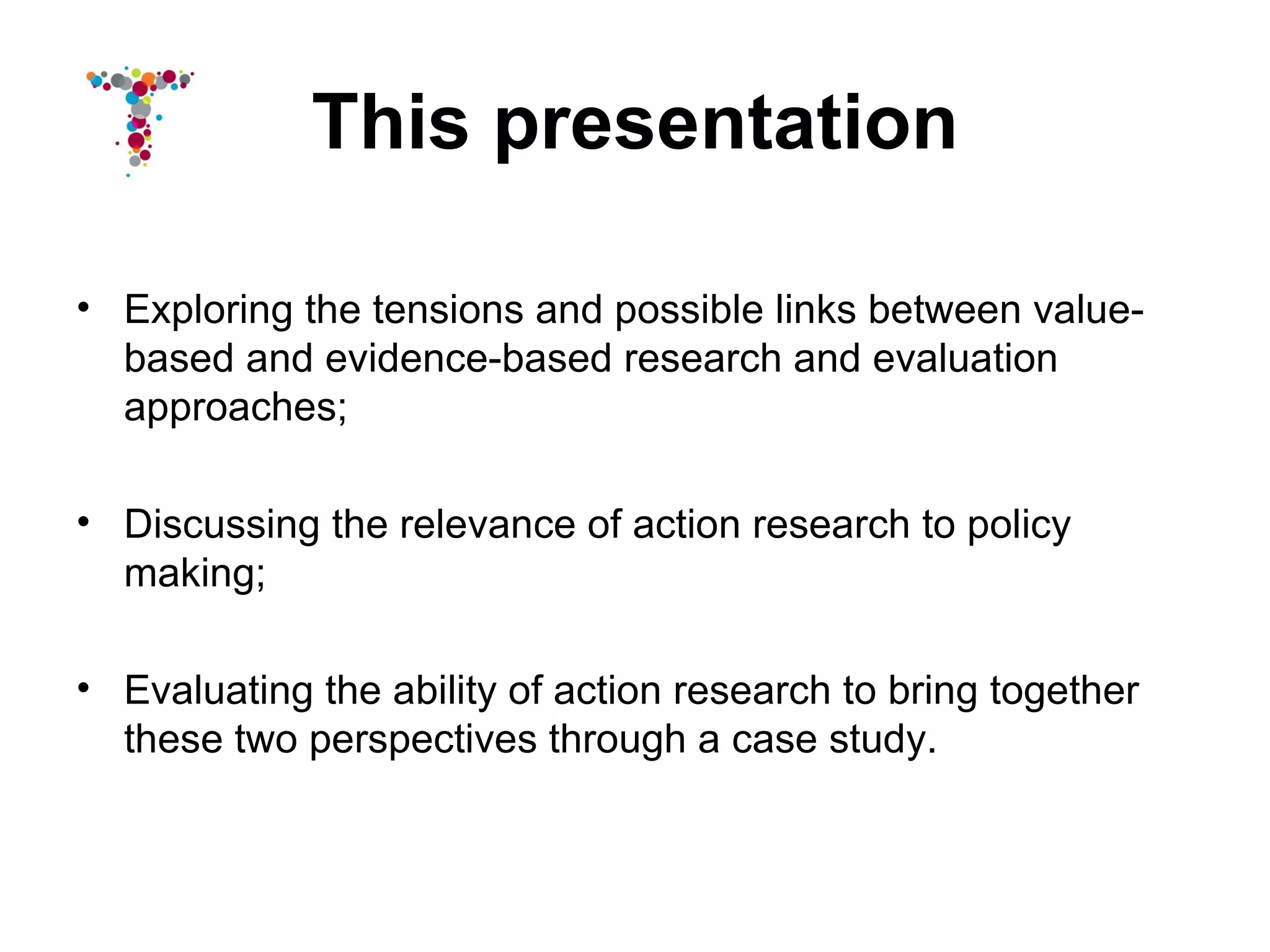 The document discusses action research as a methodology that brings together value-based and evidence-based approaches. It explores tensions between these approaches and how action research can bridge them. As an example, it summarizes an evaluative action research case study of the Nottinghamshire County Council Fostering Futures Therapeutic Service that applied action research principles of participation and collaboration to achieve a deeper understanding of foster care processes and develop ongoing research capacity.