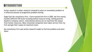 A mobile service provider company came to the author's consultancy firm with complaints about poor service quality and unmotivated employees. [The consultancy firm] used action research to identify problems like poor team bonding, lack of growth opportunities, and no recreation facilities. To solve these, they recommended a team building workshop, giving employees freedom and rewards for new ideas, and adding recreation facilities. After implementing the solutions, complaints were reduced significantly. The author notes action research is effective if steps are followed properly, as it brings change and new knowledge while allowing organizations to learn what works.