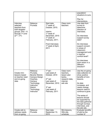 This document outlines an action research plan with the goal of creating an equitable schedule for mobile laptop labs that promotes their usage across grade levels. The plan involves surveying teachers to understand barriers to lab use, researching best practices, interviewing select teachers, creating mini-lessons to address needs, and using a wiki to document progress. Data will be collected through ongoing surveys, the interactive schedule, and wiki comments to evaluate the effectiveness of interventions in increasing equitable access to the mobile labs.