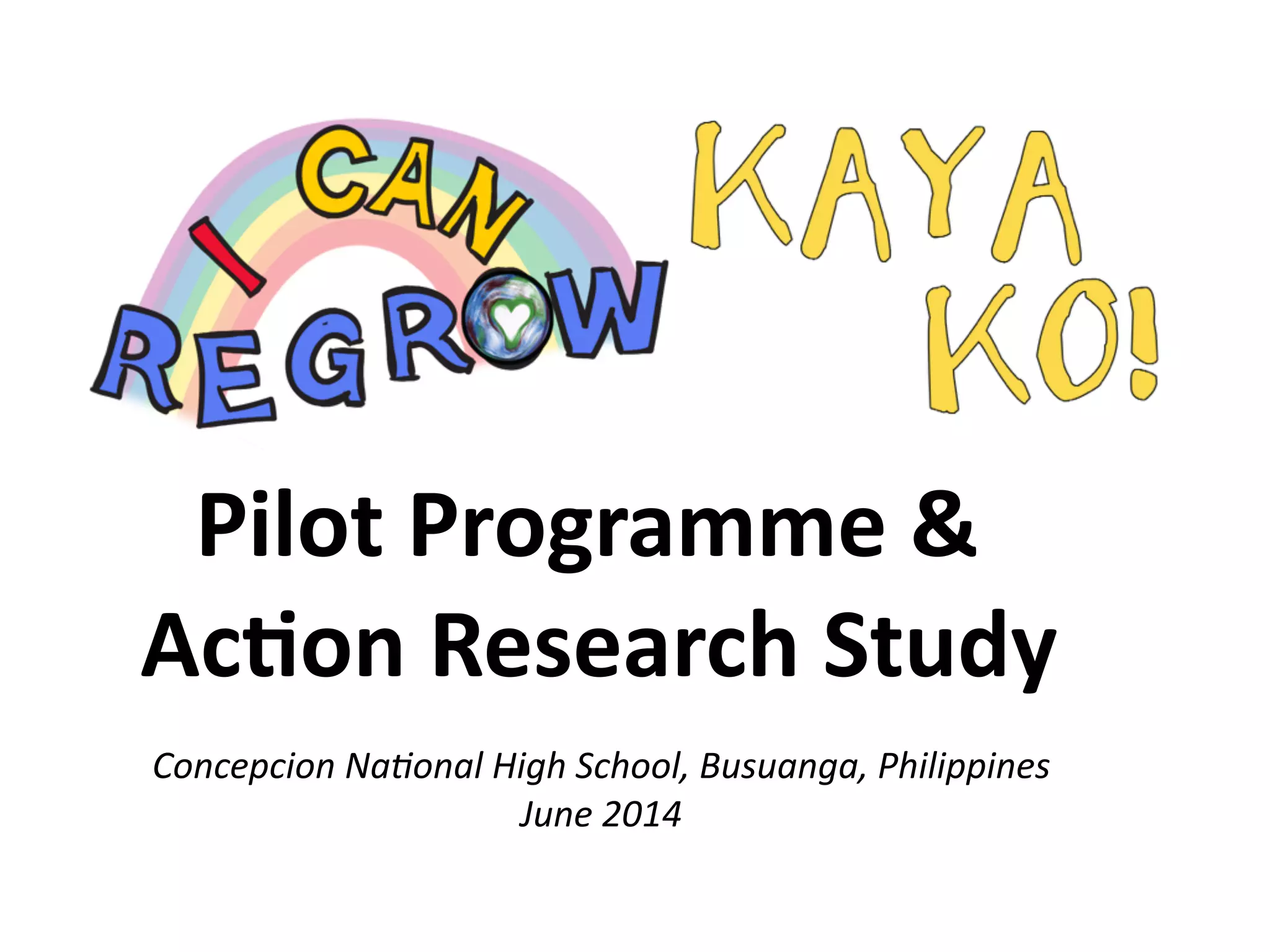 This document provides details about a pilot programme and action research study conducted at Concepcion National High School in Busuanga, Philippines from June to November 2014. The study examined the impact of a mindfulness-based and community rebuilding intervention on learners affected by Typhoon Yolanda. 252 students and 25 teachers participated in a week-long intervention and were asked to complete workbooks and surveys over the following months. The study aimed to understand the issues faced by students, evaluate how community members responded to student-led change projects, and determine if the intervention helped develop students' emotional resilience.