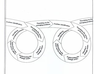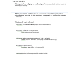 This document provides an introduction to action research for teachers. It discusses key concepts of action research including that it is focused on improving practice, owned by teachers, involves systematically examining evidence to produce knowledge about what works in a particular context. It also notes action research is collaborative and aims to problem-pose rather than problem-solve. The document provides some examples of action research questions and models, including describing a problem, intervention, data collection and understanding if the intervention is successful. It aims to give teachers an overview of action research and how it can be applied to improve teaching practices.