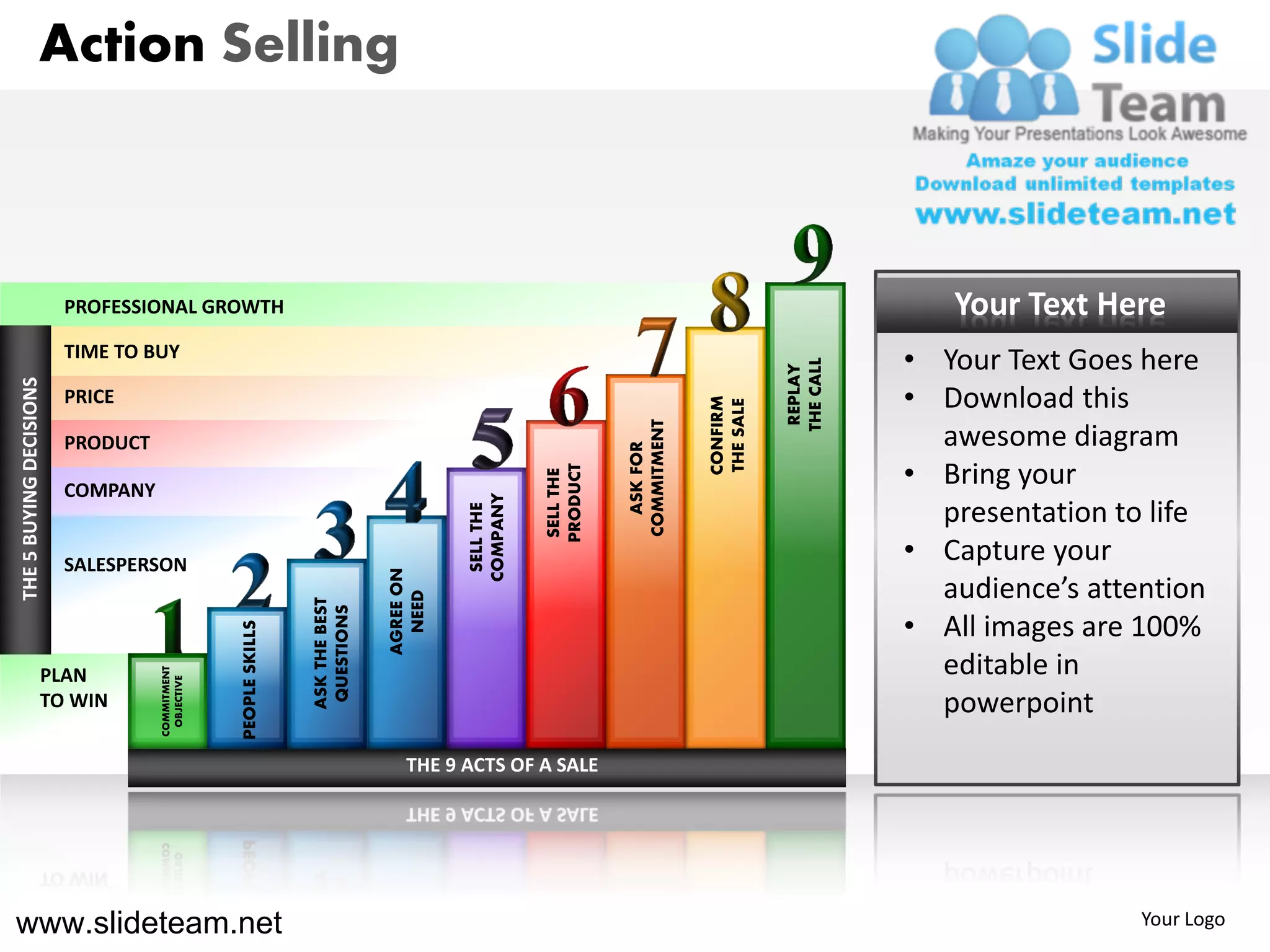 The document outlines the 5 buying decisions and 9 acts of a sale. The 5 buying decisions are product, price, company, salesperson, and commitment/objective. The 9 acts of a sale are plan to win, ask the best questions, agree on need, sell the company, sell the product, ask for commitment, confirm the sale, replay the call, and professional growth. The diagram shows the interconnection between the 5 buying decisions and 9 acts of a sale in the sales process.