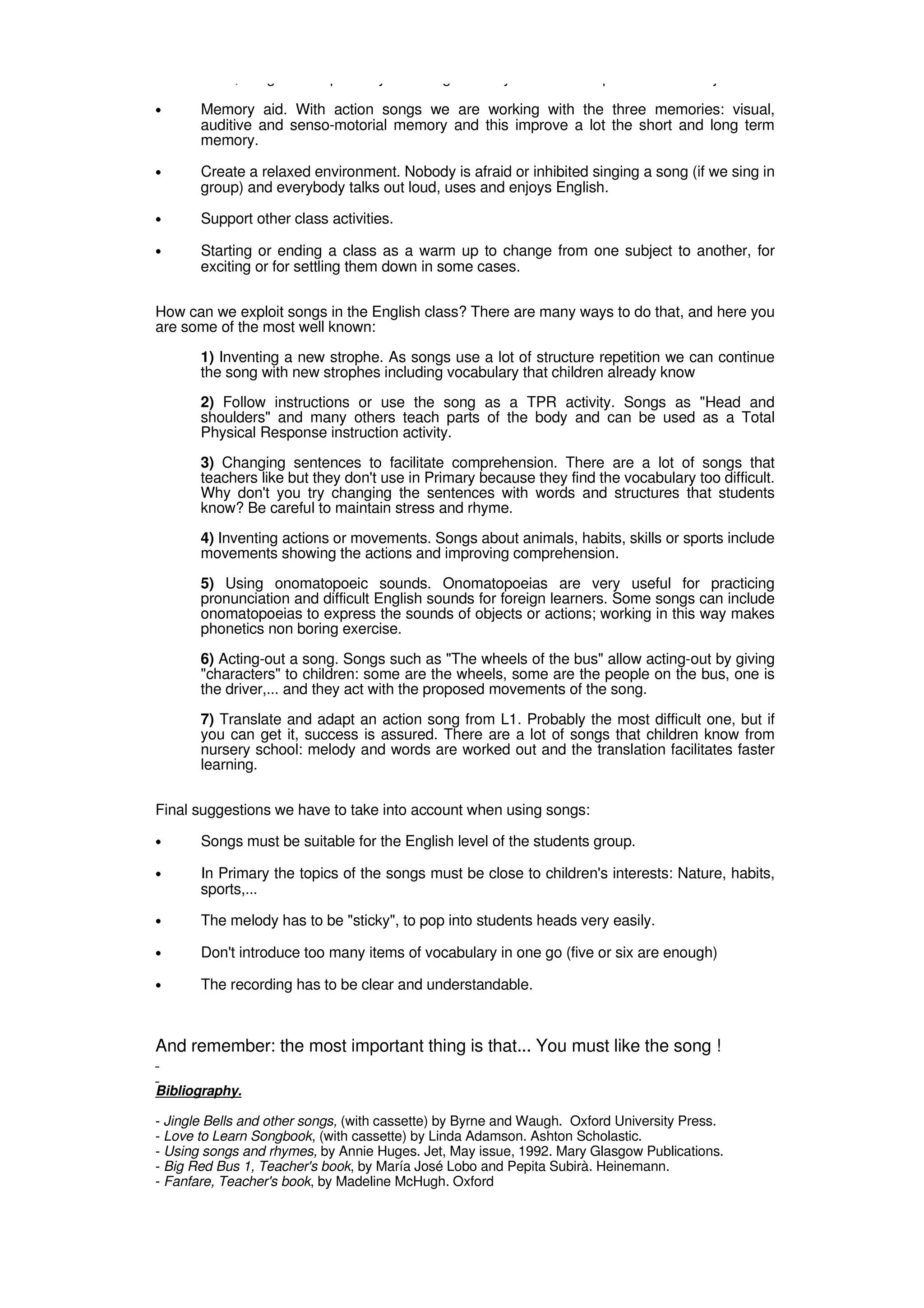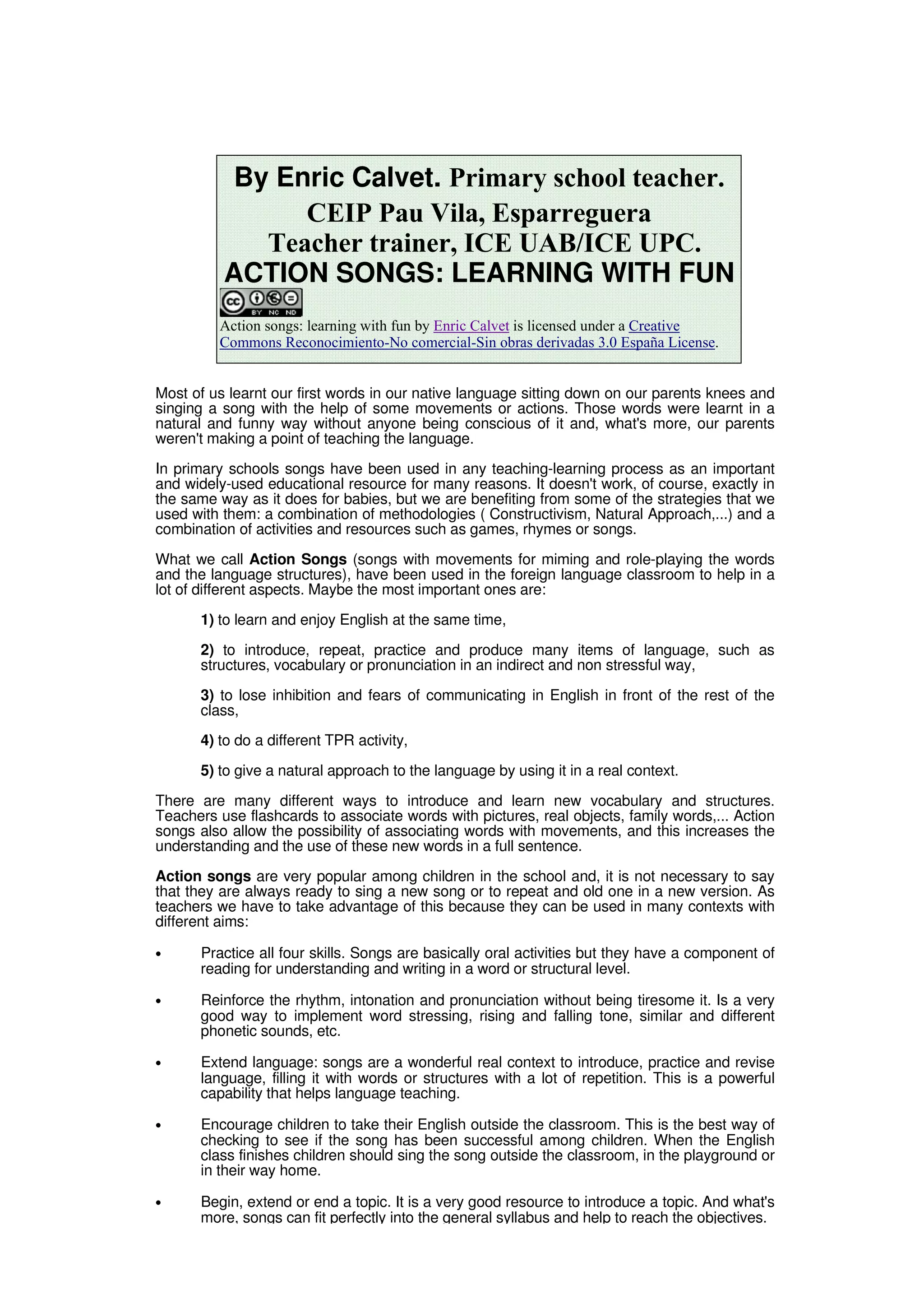 The document discusses the use of action songs as an effective educational resource for teaching English to primary school children, leveraging natural learning methodologies and incorporating movements to enhance engagement. It highlights various benefits such as vocabulary acquisition, improved pronunciation, and creating a relaxed learning environment, while also providing strategies for integrating songs into lessons. Additionally, it emphasizes the importance of choosing appropriate songs and ensuring they resonate with children's interests.