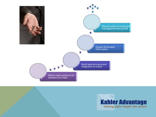 The document emphasizes the need for timely and actionable information in business, highlighting the importance of defining the right questions to guide data collection and reporting. It advocates for building flexible data structures and system integrations to accommodate evolving information needs, which can drive effective management and growth. Additionally, it recognizes the potential of new data sources like social media and mobile devices in enhancing analytics.
