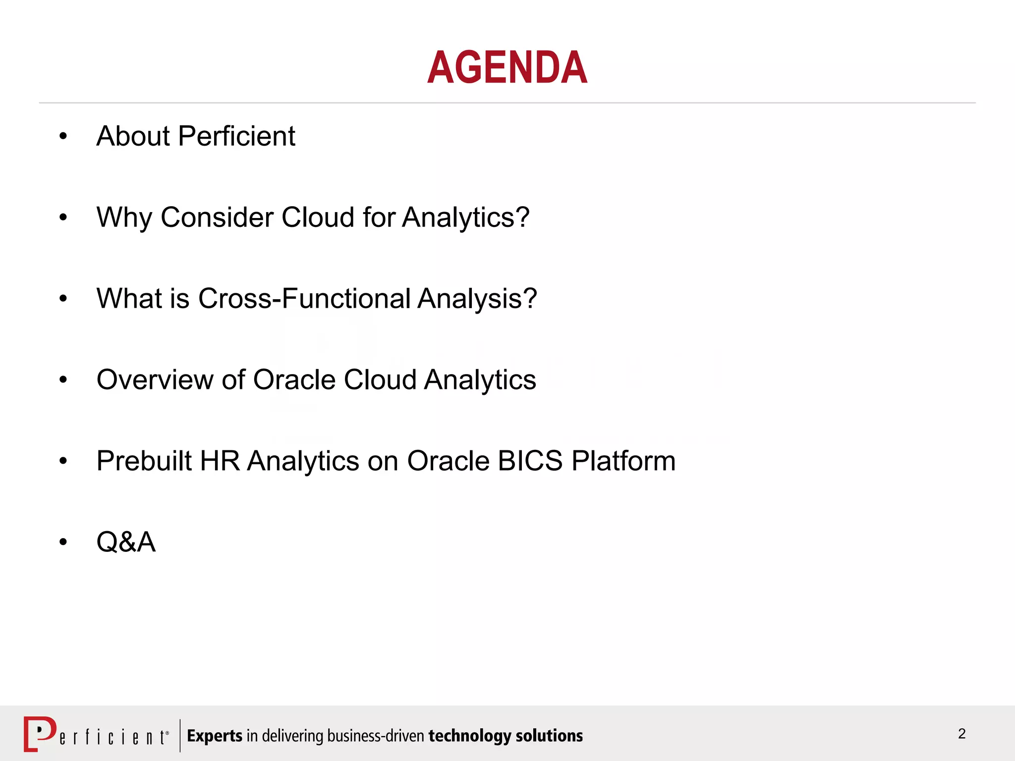 The document outlines a presentation on mastering hybrid analytics with a focus on Oracle Cloud Analytics and the advantages of cloud-based analytics solutions. It features Perficient’s expertise in Oracle BI, highlighting successful implementations and the benefits of cloud analytics like lower costs and improved self-service capabilities. Additionally, it provides case studies showcasing cross-functional analysis and HR analytics, emphasizing the integration of on-premise and cloud applications.