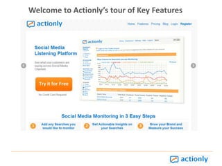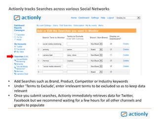 Actionly is a social media monitoring tool that tracks searches across various social networks like Twitter and Facebook. It retrieves data and displays it on dashboards where you can view metrics, top tweets, influencers, and more. It also provides sentiment analysis, tag clouds, reporting capabilities, and alerts. Multiple accounts and searches can be added for monitoring.