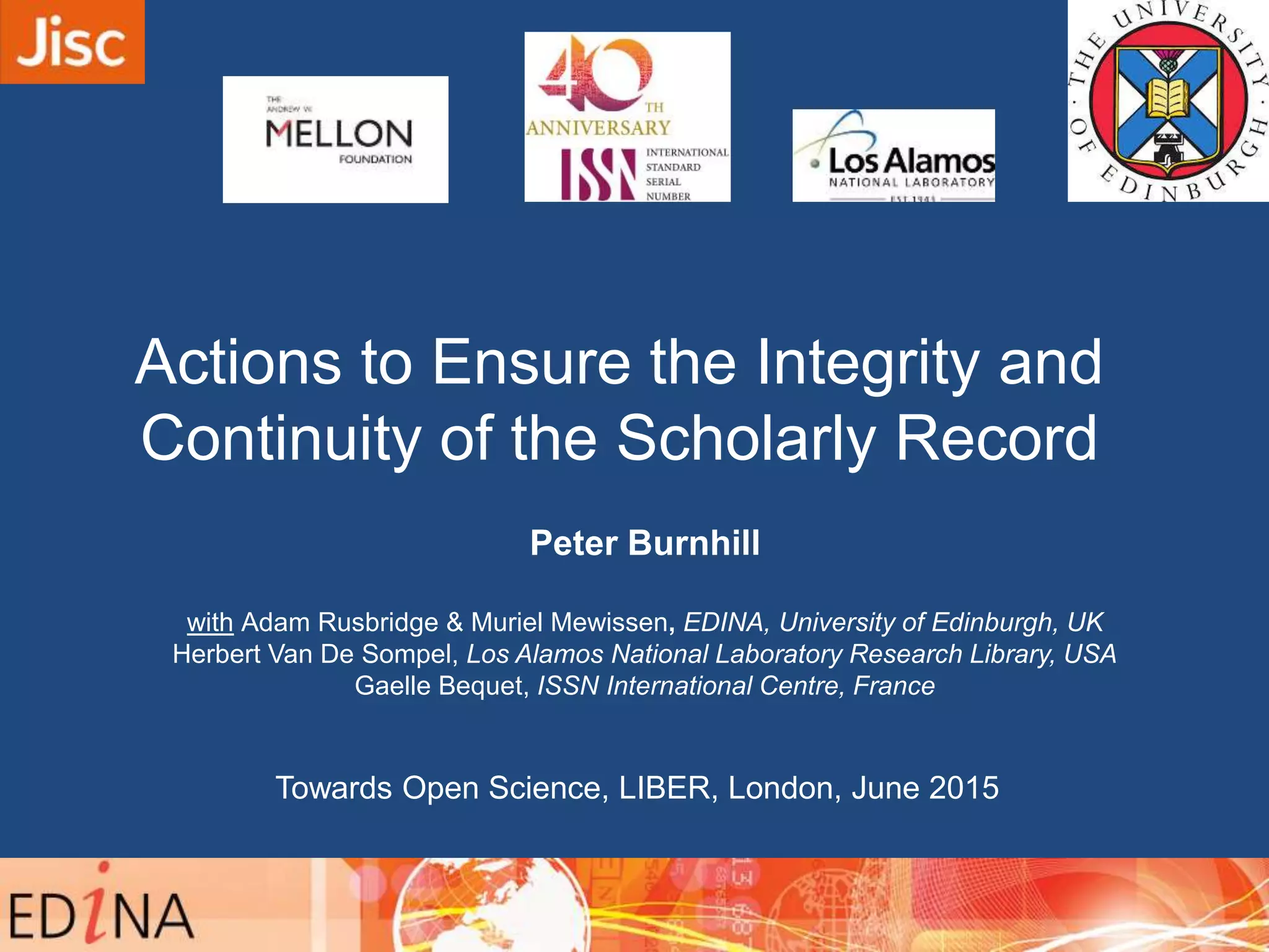 The document outlines the importance of ensuring the integrity and continuity of the scholarly record in the digital age, addressing threats such as reference rot and the loss of accessibility to digital resources. It emphasizes the need for cooperative stewardship among researchers, libraries, and publishers, alongside the development of archiving solutions like CLOCKSS and Portico. Proposed actions include utilizing registration services, providing financial support for preservation agencies, and adopting new reference management practices to safeguard scholarly content.