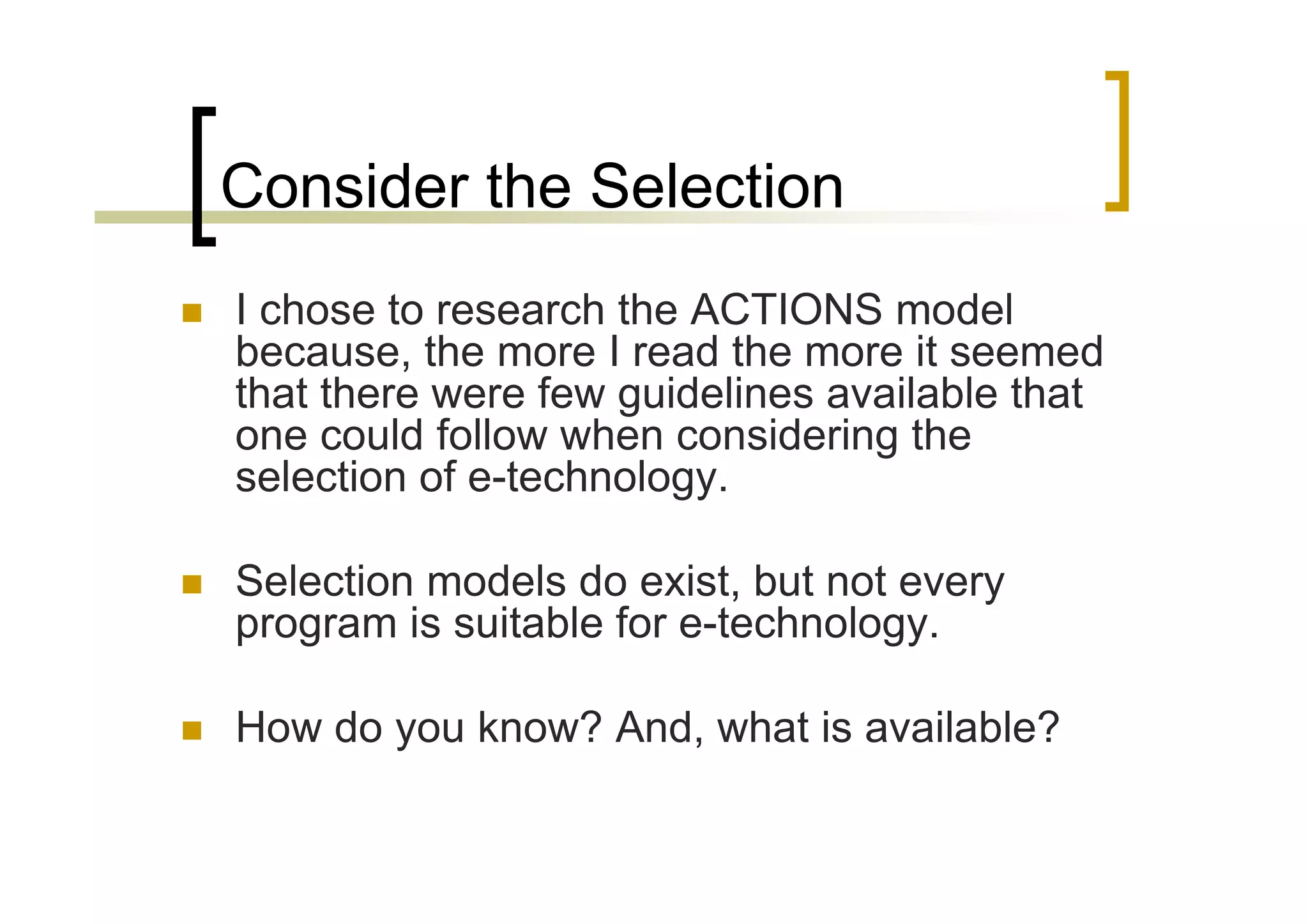 Wendy Johnson presented on the ACTIONS model, a framework developed by Tony Bates for selecting e-learning technologies. The ACTIONS model considers 7 factors for choosing the proper technology: Accessibility, Costs, Teaching & Learning needs, Interactivity & User-friendliness, Organizational Issues, Novelty, and Speed. By evaluating technologies based on these seven criteria, the ACTIONS model aims to provide institutions with guidance for selecting e-technologies that can successfully support their educational goals now and in the future.