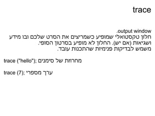 trace output window. חלון טקסטואלי שמופיע כשמריצים את הסרט שלכם ובו מידע ושגיאות ( אם יש ). החלון לא מופיע בסרטון הסופי . משמש לבדיקות פנימיות שהתכנות עובד . trace ("hello"); מחרוזת של סימנים trace (7); ערך מספרי