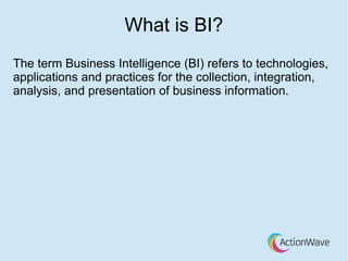 Business Intelligence (BI) encompasses technologies and practices for analyzing and presenting business data to enhance decision-making. Predictive analytics, a subset of BI, employs various techniques to forecast future events based on current data. The document also mentions specific applications in healthcare, such as developing predictive models for hospital readmissions.